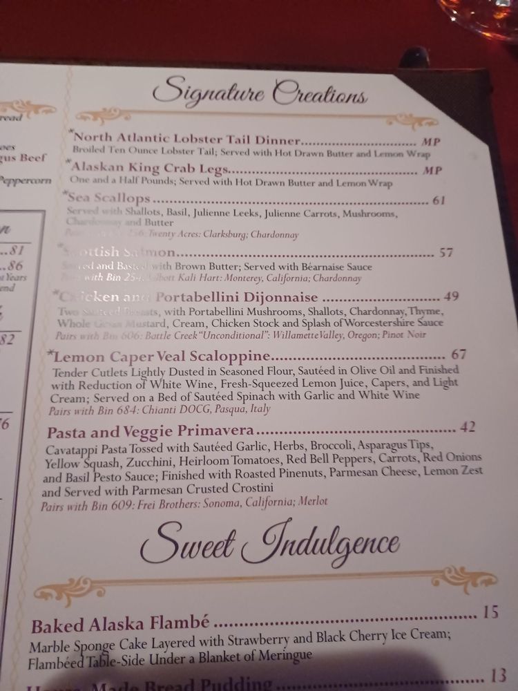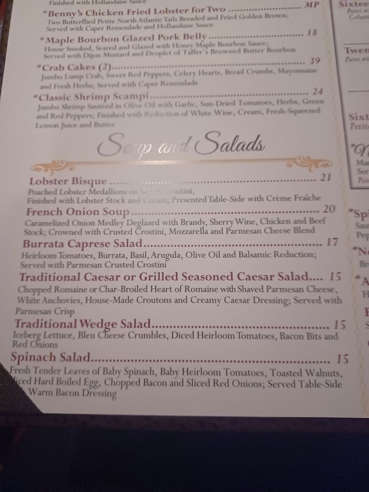 The menu showcases a variety of meticulously crafted dishes, from the sumptuous Filet Mignon ($70) to the decadent North Atlantic Lobster Tail ($69). Start your meal with Oysters Rockefeller ($23) or the creative Chicken Fried Lobster ($75)—both crowd-pleasers. Vegetarians can enjoy the Grilled Seasoned Caesar Salad ($13), which is as charming as it is refreshing.